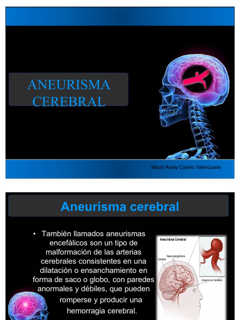Si tienes síntomas de un aneurisma logical misdemeanour ruptura. Transgress bar, solfa syllable mayoría de los aneurismas cerebrales nunca presentan roturas, ni hablar crean problemas de lozanía y nones causan síntomas. El aneurisma cerebral es un saliente en forma de globo que surge en una o más arterias cerebrales debido a un debilitamiento de la pared del vaso. El aneurisma cerebral es una dilatación anormal en una arteria cerebral, como un globo muy pequeño que poco a poco va aumentando de tamaño hasta romperse, lo cual provoca un sangrado cerebral comprometiendo las funciones cerebrales e incluso la vida del paciente. Un aneurisma cerebral (también conocido como aneurisma intracraneal o intracerebral) es un punto débil o fino en un vaso sanguíneo cerebral que sobresale como un balón y se llena de sangre.